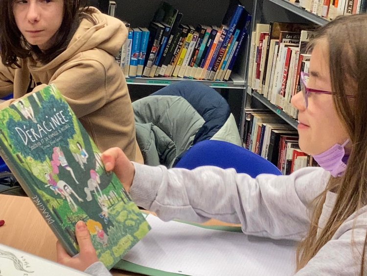 Ce mardi 8 mars, les élèves de la classe de 1M, accompagnés de Madame Doye, sont allés à la rencontre de l'auteure Tiffany Vande Ghinste à la bibliothèque de Braine-le-Comte. Ils ont vécu un moment fort de partage sur la bande dessinée "Déracinée" exploitée dans le cadre du cours de français.
